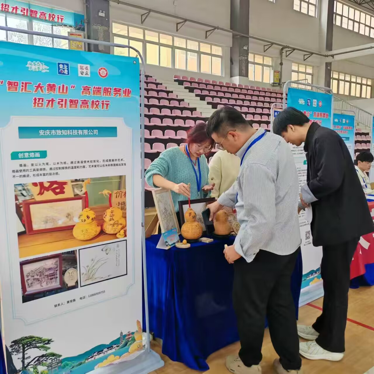 10月16日,黄瓜视频 应邀参加由黄山市人力资源和社会保障局主办的“智汇大黄山”高端服务业招才引智系列活动。该院数名学生走进安徽外国语学院进行非遗烙画的科普宣传活动。他们将所学付诸实践,进行非遗烙画的科普宣传活动。