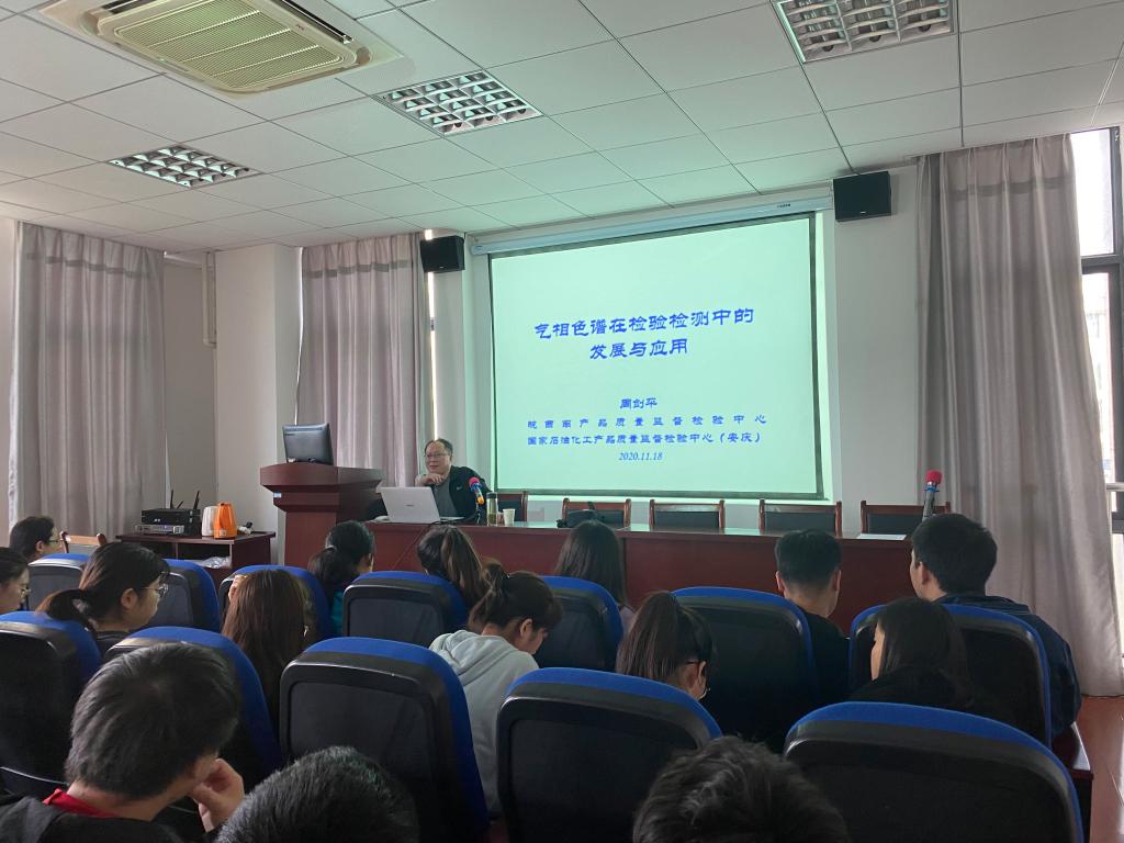11月18日下午2:30,皖西南产品质量监督检验中心高级工程师周剑平在龙山校区G楼202学术报告厅作了题为“气相色谱在检验检测中的发展与应用”的学术讲座。黄瓜视频 全体研究生、动植物检疫专业本科生和部分教师聆听了报告。报告由黄瓜视频 穆丹博士主持。