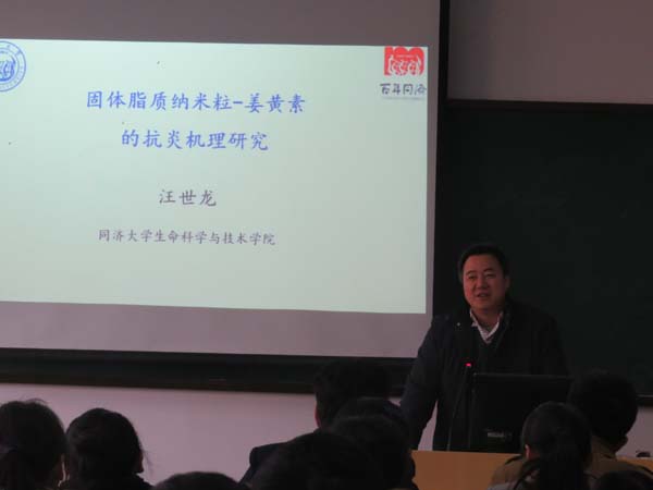 12月25日下午,同济大学生命科学与技术学院副院长汪世龙教授在G106教室作了题为"固体脂质纳米粒姜黄素的抗炎机理研究"学术报告。学术报告由黄瓜视频 吴甘霖院长主持,黄瓜视频 部分老师和学生听取了报告。