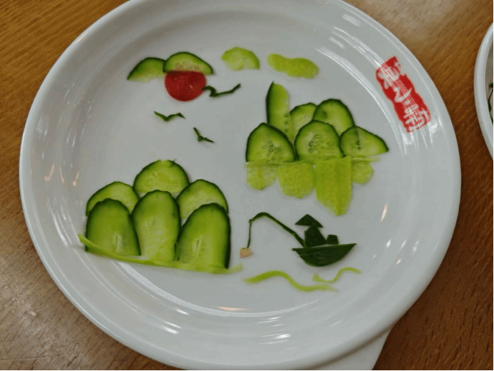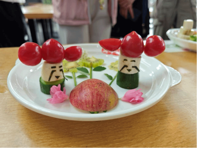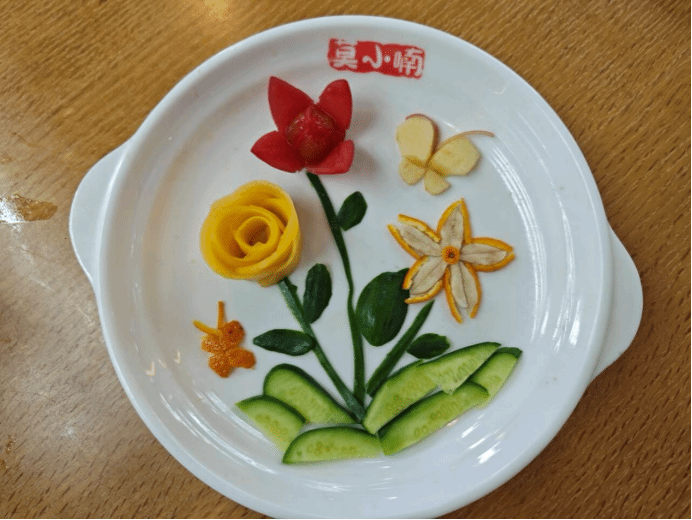 黄瓜切成的两根细条作茎,猕猴桃削成三片作花,小半个苹果压在根部,两边还站着由番茄、香蕉以及黄瓜组成的财神爷。“猕猴桃的形状象征着冬日暖阳,苹果寓意着平平安安,小番茄代表红红火火,花朵则是对美好生活的期望。”生物科学类专业2023(2)班的邢繁用生动形象的语言介绍着作品《财神送钱花》的创作理念,她表示,比赛时,自己不仅体会到了劳动的快乐,增强了动手能力,还在团队合作中增进了与朋友的友谊。
