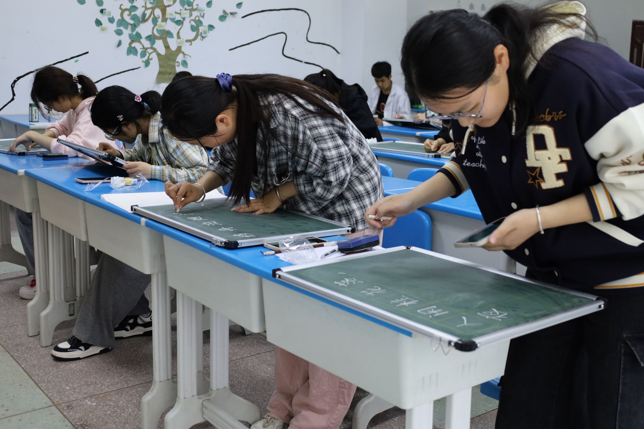比赛现场,选手们的字迹各具风采,或遒劲有力,或清雅秀健,或端正稳重,他们尽情挥毫泼墨,展示自己的书法才能。生物科学专业2022(3)班的查蕊一手扶住黑板,一手拿着粉笔,仔细确认笔画的落笔位置。“粉笔凝丹心,撇捺展师魂。写好粉笔字不仅是师范生的必备技能,还是陶冶情操的重要方式。”她坦言,粉笔字的一点一横都大有学问,成为新时代好老师的重要条件就是练好教学基本功。