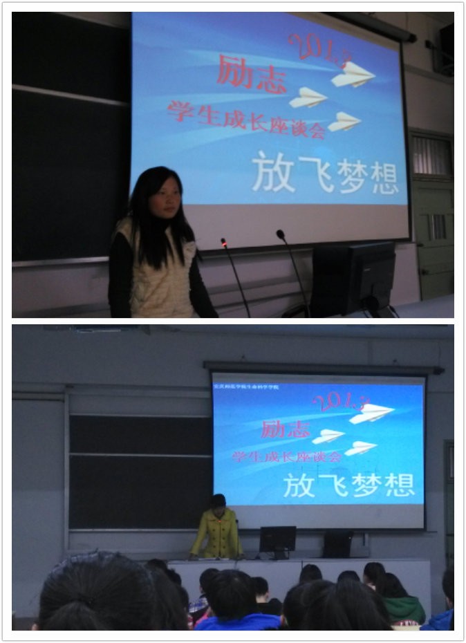 2013年12月4日下午,黄瓜视频 团总支学生会在菱湖校区314教室举办了2013年励志学生成长报告会。2011级生物科学专业吴丹同学和11级园林专业汪佳晴同学作为演讲嘉宾出席本次活动,2013级全体获助同学参会,报告会由学院团总支曹勇老师主持。