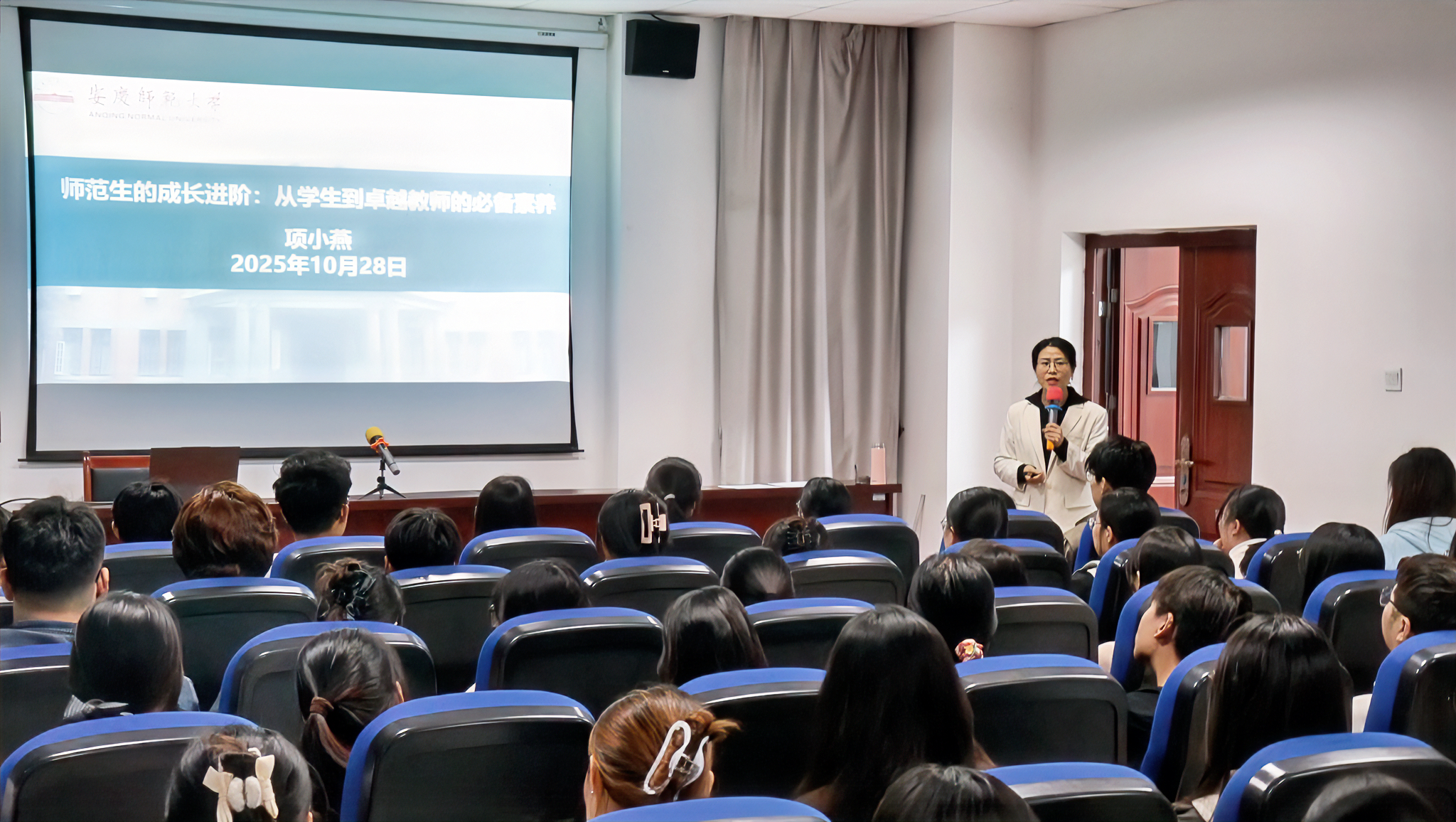10月28日,安徽省教书育人楷模、全国高校教师教学创新大赛一等奖获得者项小燕教授应邀于G202教室为师范生作《从学生到卓越教师的必备素养》指导讲座,切实提升师范生专业素养,明晰从学生到卓越教师的成长路径。讲座吸引百余名学生参与,现场座无虚席。