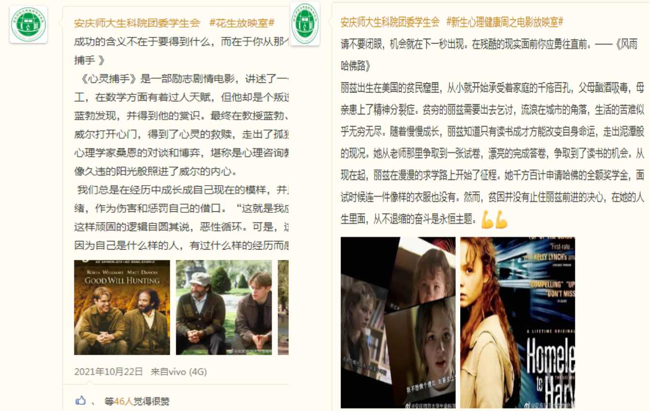 在心理健康周期间,黄瓜视频 团委学生会官方QQ在活动期间每天推荐一部与心理健康相关的电影,分享的影片有《心灵捕手》、《心灵奇旅》、《风雨哈佛路》和《凯蒂和爷爷》等等。通过介绍影片内容,宣传心理健康知识。