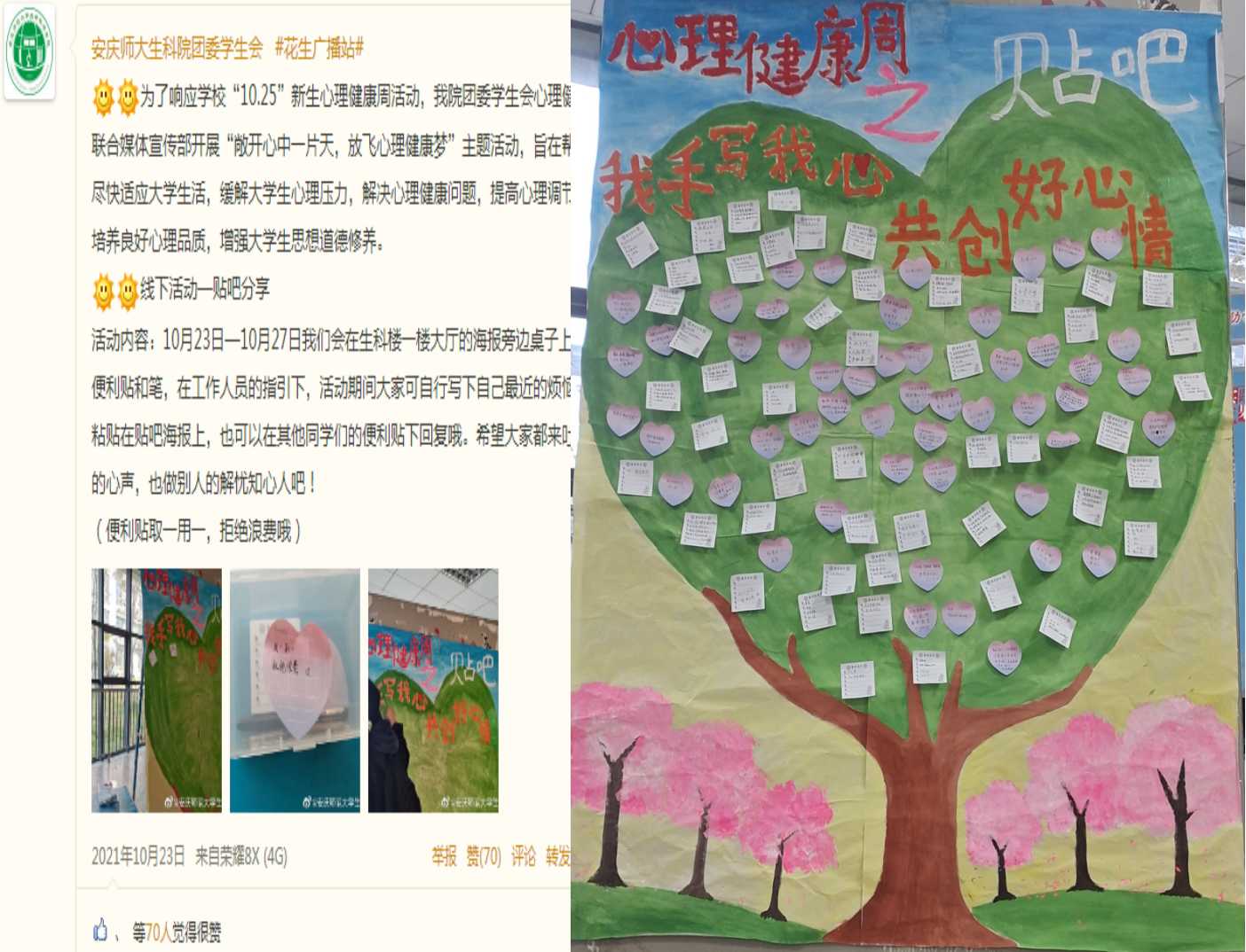 “我手写我心,共创好心情”。通过便利贴记录的形式,让同学们在“美丽心情树”展板上分享自己的趣事、烦恼或者愿望,以求当做一个心灵树洞来起到悦纳自我,包容自我的作用。其他同学也可对别人的分享做回复,积极做别人的解忧知心人。活动期间,大家踊跃参与。小小的“树”上“挂满了”同学们的心情。2020级生物科学专业夏玉婷说“此次活动给了我们分享心情的平台,在这里我分享的烦恼还得到了别人的回复,鼓励的话语让我感到温暖。同时,我也发现其实每个人都有小烦恼,但我们都要保持积极的生活态度,因为我们还有很多的梦想,每个人也都在努力”。