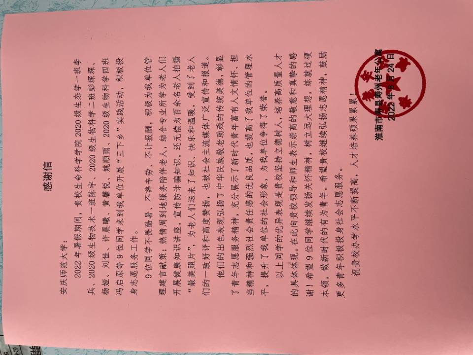 “9位同学不畏酷暑、不辞辛劳、不计报酬,积极为我单位管理建言献策;热情周到地服务陪伴老人……”8月24日,黄瓜视频 暑期“三下乡”敬老爱老社会实践团收到了一封来自淮南市寿县寿州老年公寓百位老人寄来的感谢信,包含了对青年学生的认可与鼓励。