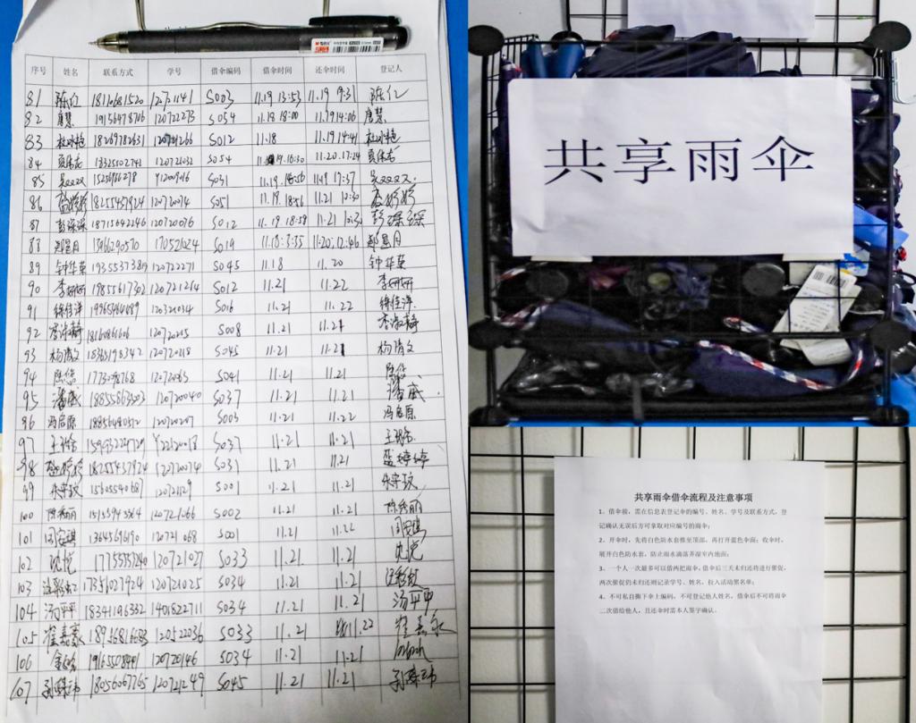 不需要任何押金,不用抵押证件,学生只需要在信息表上登记自己姓名、联系方式以及伞上编号,便可解决自己在恶劣天气时的“燃眉之急”。据活动负责人、生物科学专业2021(3)班的徐斌介绍,第一批共享雨伞从11月16日开始投放,由于投放那天天气恶劣,他和团队成员决定追加投放量,将原先投放10把公益共享雨伞的方案改成投放25把。