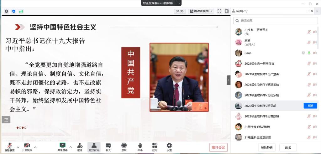 张晓雅同学从“坚持中国共产党领导”“坚持中国特色社会主义”“实现高质量发展”“发展全过程人民民主”“提高人民精神境界”“实现全体人民共同富裕”“促进人与自然和谐共生”“共建人类命运共同体”等八个方面向同学们介绍了中国式现代化是如何推进中华民族伟大复兴的。通过结合习近平总书记在党的二十大中“中国式现代化是中国共产党领导下的社会主义现代化,既有各国现代化的共同特征,更有基于自己国情的中国特色”的重要论述,从理论到实践、历史和人民的选择维度、本质到现象、过去总结到现有成就以及未来展望等方面向同学们进行了详细的阐述和论证。