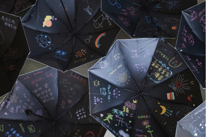 小熊维尼、动感超人、励志语录……原本纯黑的伞面在参与者的绘制下变得五彩斑斓起来。近三个小时的时间,共有30把共享雨伞完成制作,它们被撑开放在一旁晾晒,就像一朵朵盛开的花朵,等待防水颜料完全干透便可投入使用。