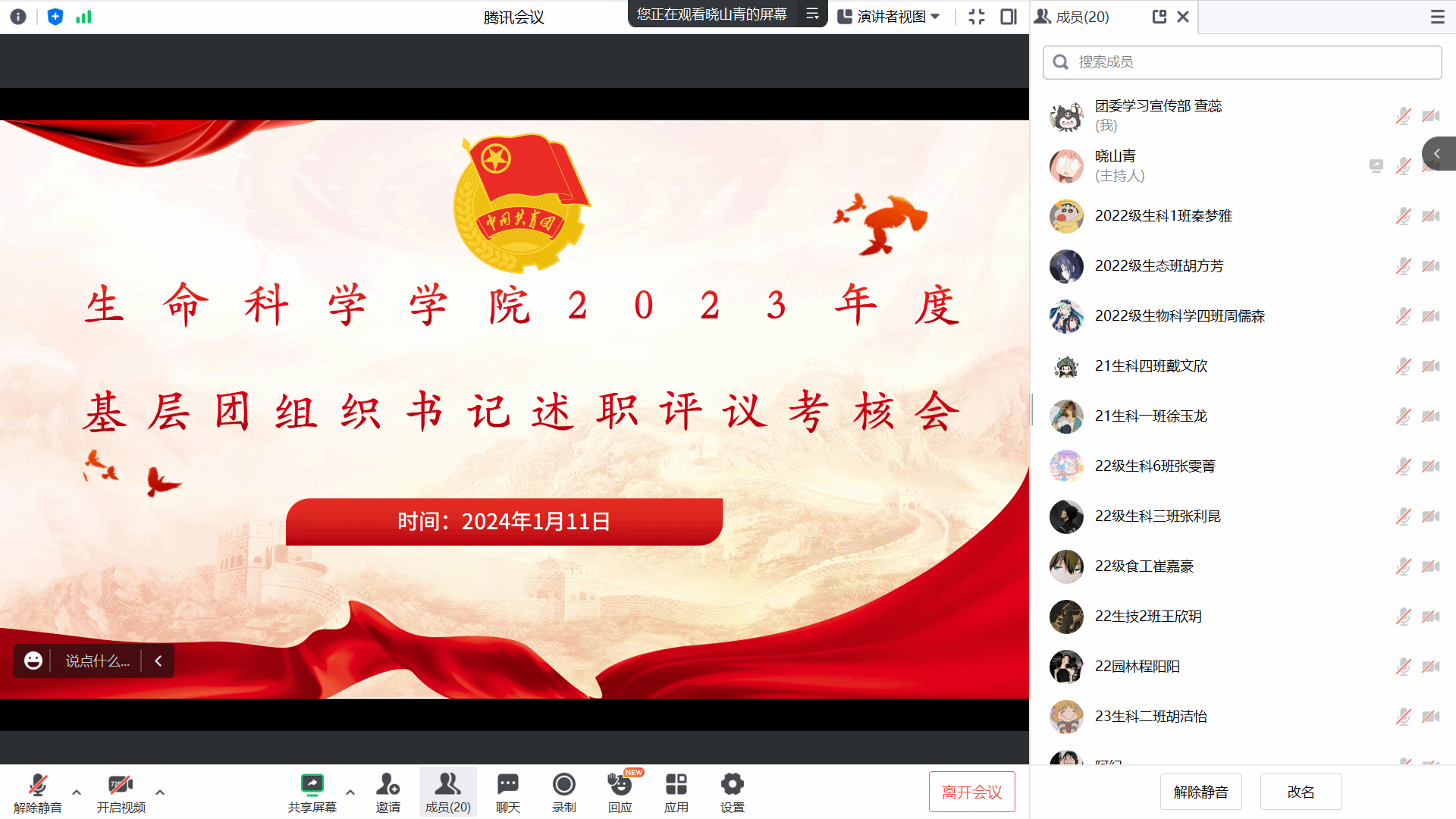 1月11日,黄瓜视频 在线上召开2023年度基层团组织书记述职评议考核会,对2022级各班团支部进行现场述职考核,进一步推动基层团组织的组织力、引领力、服务力和大局贡献度协同提升,各班团支书及团委负责人徐启凤参加会议。