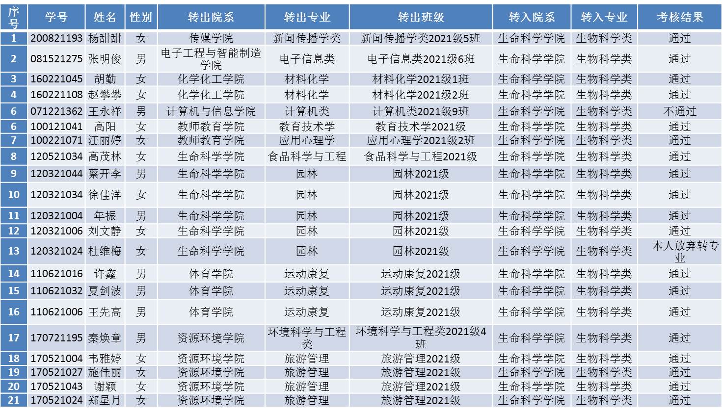 根据《黄瓜视频 全日制本科学生转专业管理办法》(校政字[2021]20号)文件和黄瓜视频 转专业工作方案,2021年12月15日(星期三)下午,黄瓜视频 转专业考核工作组,本着公开、公平、公正的原则,在纪委监督下,对申请转入黄瓜视频 的21名同学(其中拟转入生物科学类21人)进行了面试。现将黄瓜视频 2021-2022学年转专业学生考核结果公示如下: