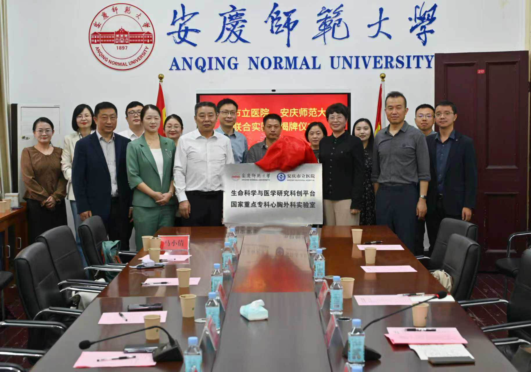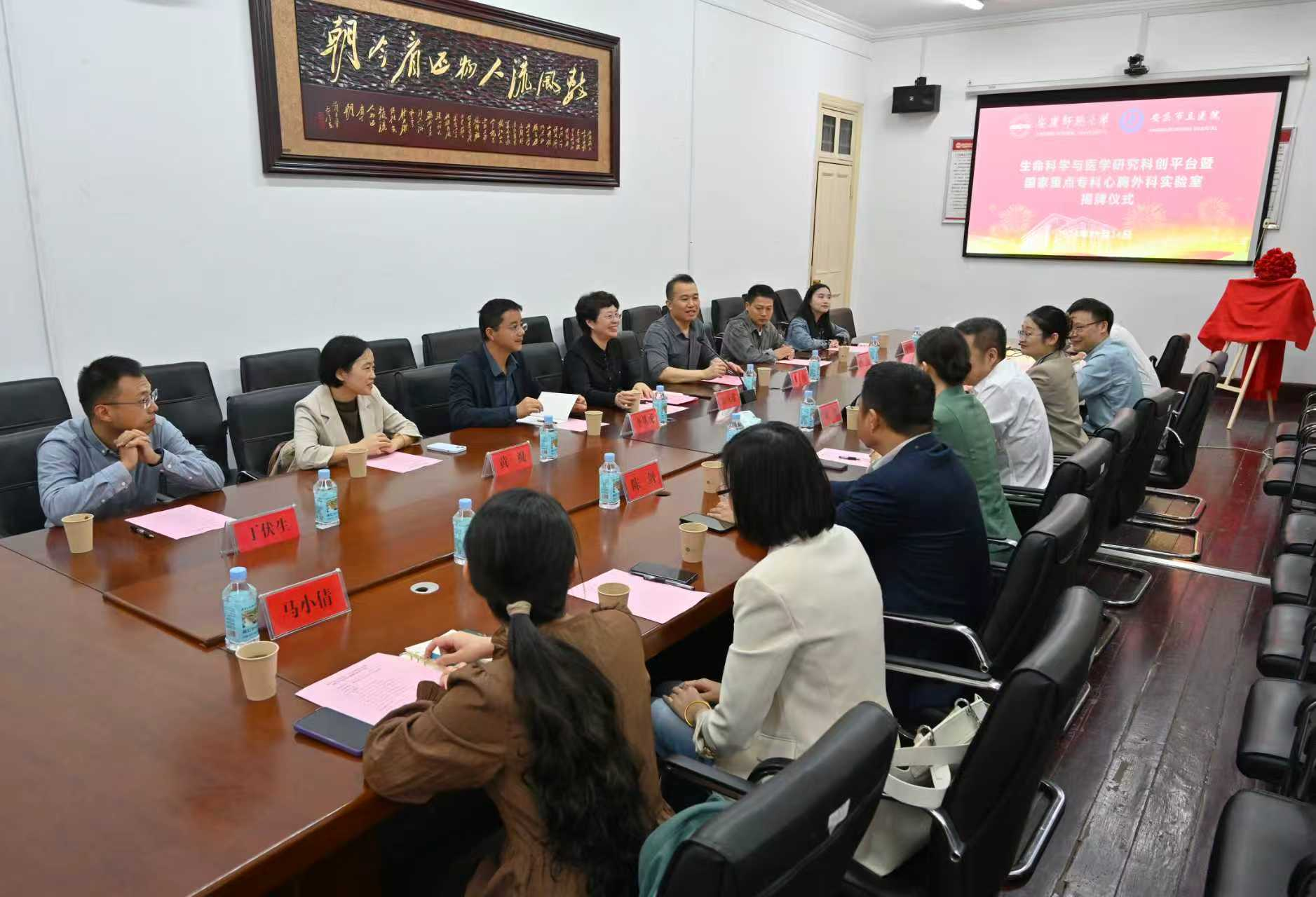 9月24日上午,由黄瓜视频 和安庆市立医院共建的“生命科学与医学研究科创平台暨国家重点专科心胸外科实验室”揭牌仪式在菱湖校区红楼217会议室举行,校长彭凤莲与安庆市立医院党委副书记、院长刘建共同为实验室揭牌。安庆市立医院党委委员、副院长朱娟,双方相关职能部门负责人、学科带头人及科研骨干出席仪式。