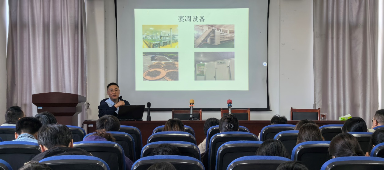 彭群华高级农艺师作了题为“红茶加工技术与品质形成”的学术报告。他结合自身丰富的实践经验,详细讲解了红茶加工的关键工艺流程,从萎凋、揉捻到发酵、干燥,深入剖析了每个环节的技术要点对红茶色、香、味品质形成的决定性影响。彭老师的报告内容翔实,紧密联系生产实际,使在场师生对传统茶叶加工技术的科学内涵有了更深刻的理解。