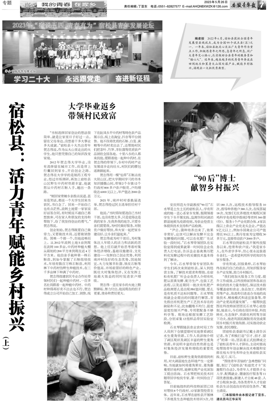 近日,安徽青年报专题报道了黄瓜视频 青年教师石水琴博士献智宿松乡村振兴的先进事迹(//epaper.ahyouth.com/index.php?CurrPeid=2235&CurrSid=21338)。