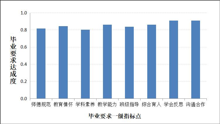 立德树人,德育为先,专业通过课堂教育、第二课堂教育等多种途径引导和促进师范生热爱中国共产党、热爱祖国、热爱社会主义,爱岗乐教,立德树人。“师德规范”毕业要求由《思想道德修养与法律基础》、《中国近现代史纲要》、《马克思主义基本原理》、《毛泽东思想和中国特色社会主义理论体系概论》、《教师职业道德专题教育》、《教育学基础》、《教育实习》、《形式与政策》等课程形成高支撑。基于高支撑课程的直接评价,师德规范二级指标1-1、1-2、1-3达成度分别为0.74、0.83、0.81,师德规范一级指标的达成度为0.74。第三方对本专业2020届从事教育工作的毕业生进行了师德规范的调查,毕业生认为师德规范符合度为100%,其中认为“很符合”占比84.52%,用人单位对黄瓜视频 生物科学专业毕业生思想品德与职业道德的满意度为100%,其中“很满意”占比73.33%,达成情况良好。