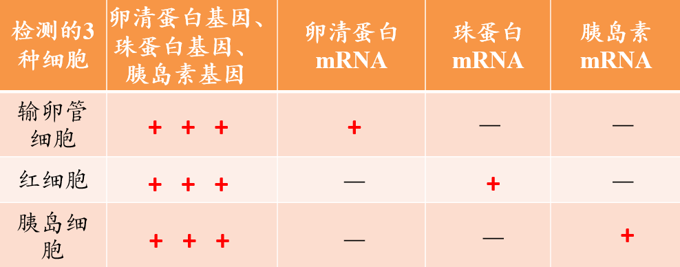 2.3种细胞中的DNA都含有卵清蛋白基因、珠蛋白基因和胰岛素基因,但只检测到其中一种基因的mRNA,这一事实说明了什么?