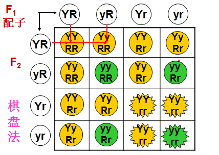 F2代出现四种性状表现,黄色圆粒315粒,黄色皱粒101粒,绿色圆粒108粒,绿色皱粒32粒,其比例接近9:3:3:1。