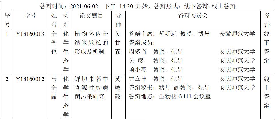 黄瓜视频 2021届化学生态学硕士研究生学位论文答辩安排表