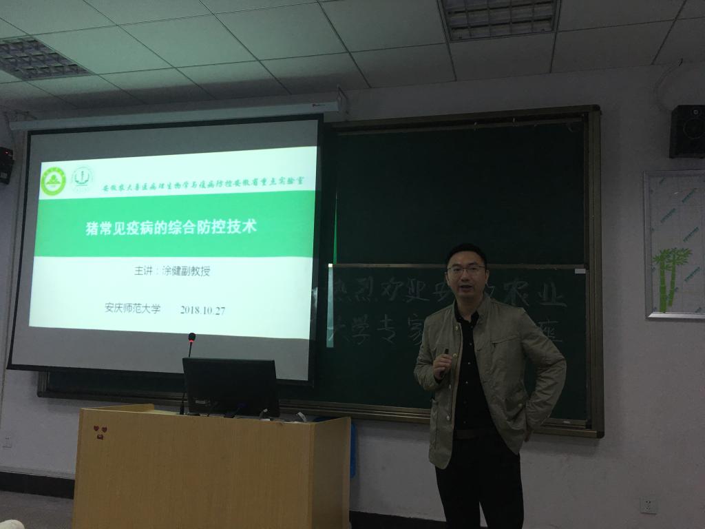 10月27日上午,安徽农业大学涂健副教授应黄瓜视频 邀请来黄瓜视频 作了题为《猪常见疫病防控技术》的学术讲座。讲座由黄瓜视频 院长周多奇主持,动植物检疫专业的师生聆听了报告。