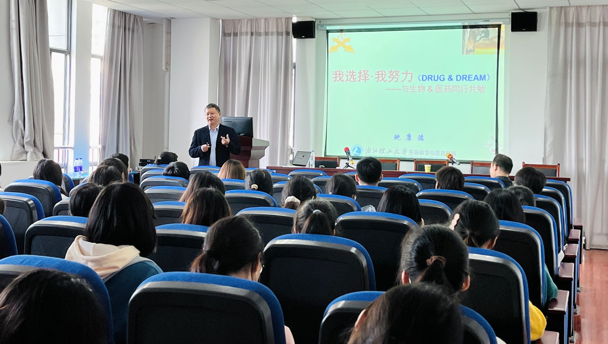 鲍康德高级工程师结合在药品生产企业工作经历,从生命科学与医药相关专业人才培养和社会需求角度,就我国医药行业的发展现状、社会真正需求的医药学人才和在校期间应关注的焦点问题等进行交流,同时提示本专业学生在校期间应在哪些方面多充电,避免一些认识误区,使自己快速适应社会、成为有用之才。鲍康德高级工程师还与现场师生开展了互动交流。