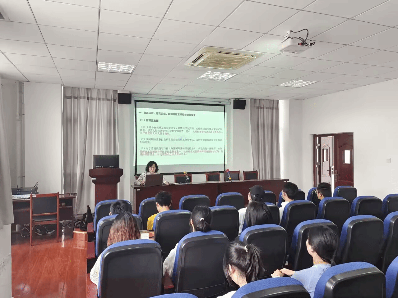 汪老师就危险化学品管理相关事项进行了培训,她强调所有危险化学品使用必须实行审批、采购、入库、领用和处理等全流程管理;各教研室及研究室不得存放剧毒化学品和易制毒化学品;学生在使用危险化学品进行实验前,教师应安排详细的指导,介绍安全操作方法及有关防护知识;使用后剩余的危险化学品,须标明品名、数量,及时交回危险化学品专用库房贮存,并办理存放登记手续;实行六双管理,既“双人保管、双人收发、双人使用、双人运输、双把锁、双本账”等。